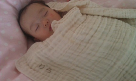 今日もリラはナッシェルで名入れしていただいたオーガニックコットンのおくるみでお昼寝中です。