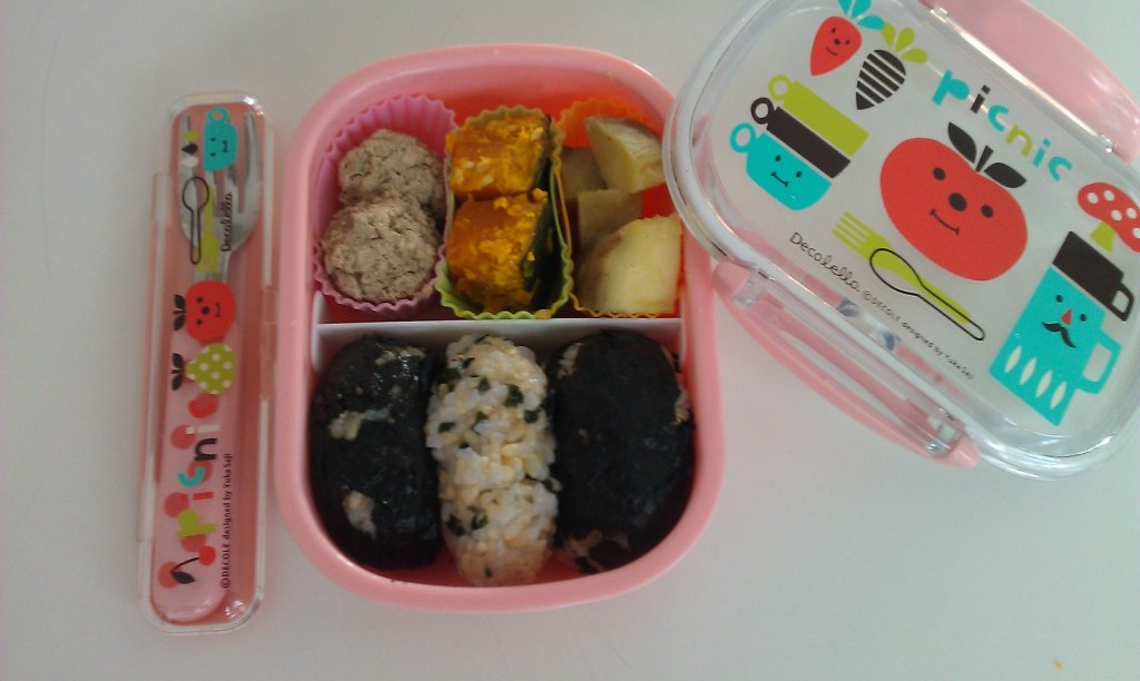 まだ歯が生えていないので、のりも小さくしてまぶしたり、きな粉やごまをまぶしたり、わかめやヒジキにしたり、野菜ピラフなど、毎日小さなおにぎりを2~3種類入れています。