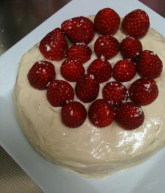 そんな打ち合わせが終わって、真っ先に家に帰り、スポンジを焼いて、水切りしておいた豆腐でホイップクリームを作り、久々にマクロビ・ショートケーキを作ってみました!