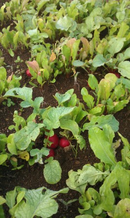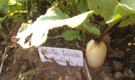 ラディッシュが土に植わっているのを初めてみたのですが、コロンと土の上に出ている姿がとってもカワイイのです。