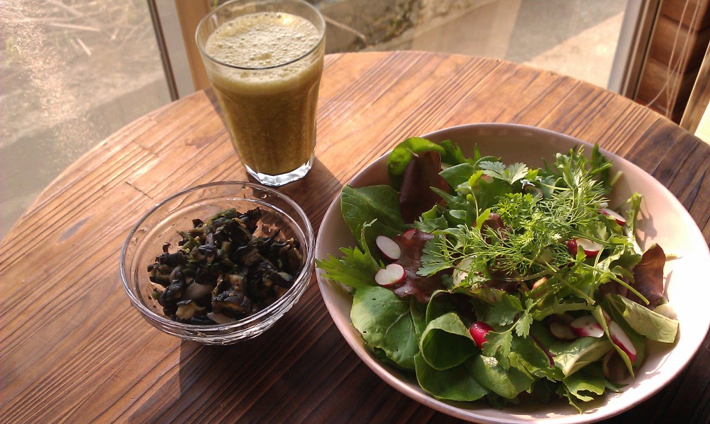 この日のランチはケール、スギナ、梨のシンプルなスムージーと、色んな野菜を少しずつミックスしたガーデンサラダ、ナス、カブなどの浅漬け。