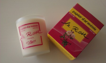 フランスの自然食品店にはどこにでも置いてある「パピエ・ダルメニィ社」の薔薇のキャンドルが一番のお気に入りです。