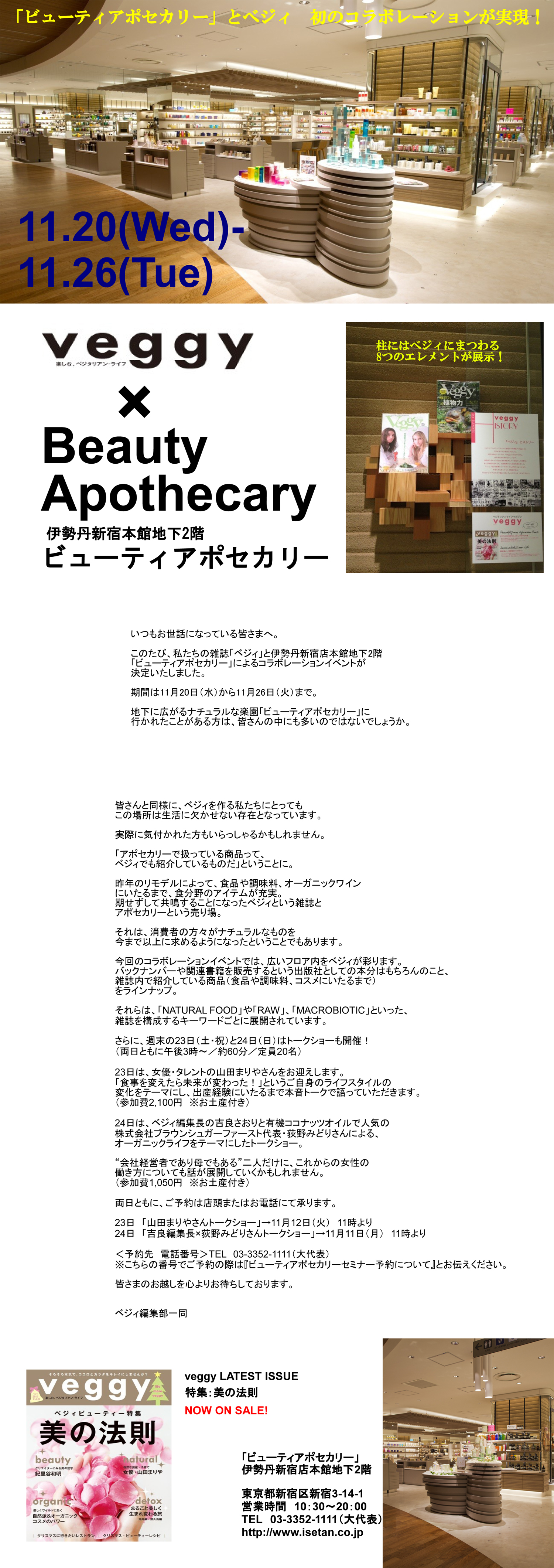このたび、私たちの雑誌「ベジィ」と伊勢丹新宿店本館地下2階「ビューティアポセカリー」によるコラボレーションイベントが決定いたしました。