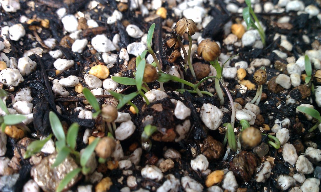 コリアンダーは帽子を被ったまま芽吹いています♪