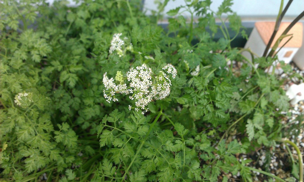 ベランダのセルフィーユからエディブルフラワーが咲き始めました。