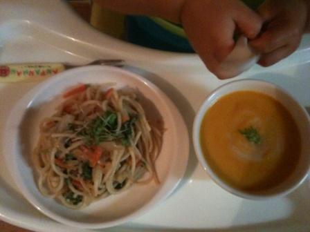 昨日の夕食はマクロビ・ジンジャー・パンプキンスープと根菜パスタでした。