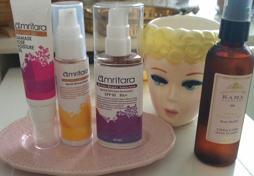 この夏、毎日私が使用しているのは、左からアムリターラのローズジェル、藻に含まれるアスタキチン酸なども含まれる甘夏シリーズ、ベリーズ・サンスクリーン、右はインドのアーユルヴェーダコスメKAMAのローズローションなど。