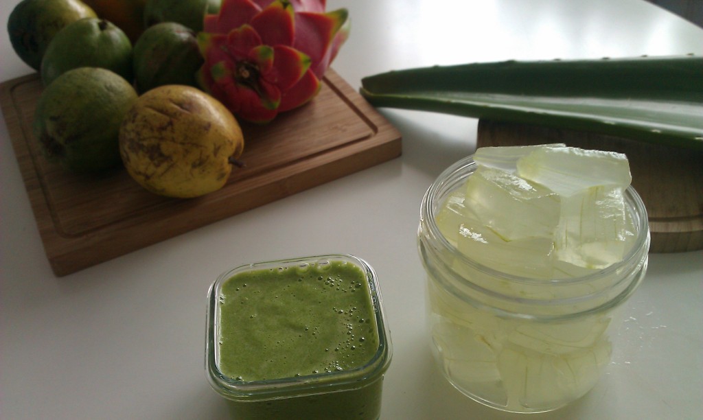 そんな感じで、夏の日焼けを鎮めるために、最近はアロエとハチミツをブレンドしたパックをしたり、アロエ・ジュースやスムージーを良く飲んでします。