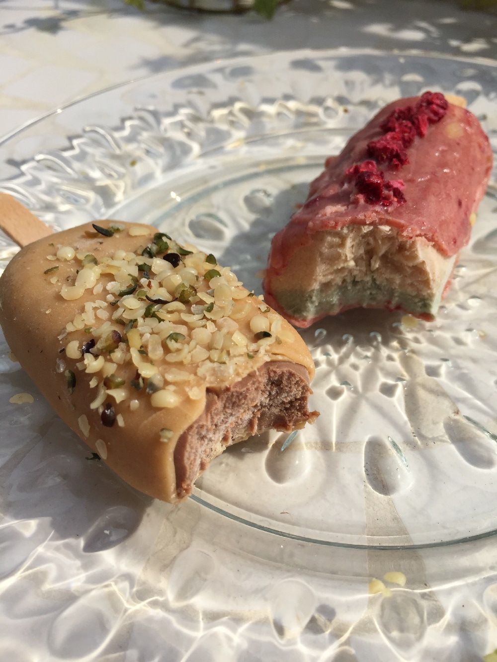 アイスを2層にしたり、ローチョコでコーティングしてヘンプナッツをトッピングしたり♪