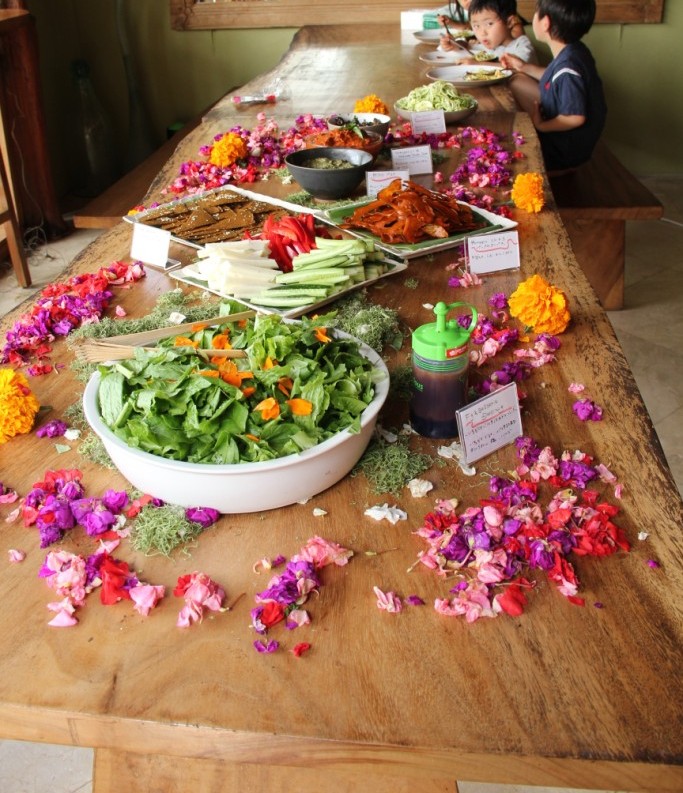 毎食、毎食、テーブルにはお花がちりばめられ、とても贅沢なローフードの食事。
