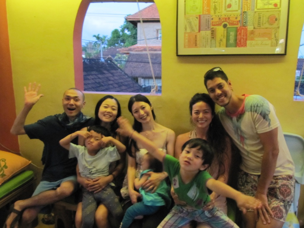 左からヨガに心理学の要素も取り入れているヨガティーチャーの秋元けんたろうさん、田中さゆりさん、私、シンヤチエさん、シェフでもあるチエさんの旦那様。